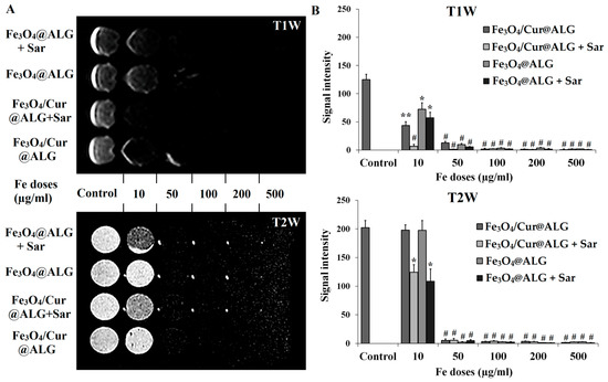 For the MRI contrast enhancement assay, we used two conditions: Fe3O4/Cur@ALG NPs mixed with (1) 1% agarose and (2) 1% agarose solution with cells. Condition 2 mimicked the environment surrounding the nanoparticles after they were injected into the body. Figure 4A shows clear differentiation in the dark signal when comparing the treated wells to the control, even from the lowest tested Fe concentration (10 µg/mL). The dark-scale color progressively darkens with increasing concentrations of Fe3O4. In addition, the dark signal in the sarcoma-180-cell-containing agarose solution is stronger than in the agarose solution alone. Quantitative analysis of the MR images reveals that the MR signal intensity is significantly higher in control than in the nanoparticle-treated wells and that a higher Fe concentration reduces the signal intensity of the MR images (p < 0.05) (Figure 4B). In the current study, we also observe that the MRI contrast is better enhanced in the T2 than in the T1 images (p < 0.05).