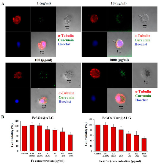 Cells were grown on Labtek chamber slides (Nunc) in RPMI 1640 culture medium and incubated with Fe3O4/Cur@ALG at concentrations ranging from 0.01 to 1000 µg/mL for 48 h. The medium was removed via centrifugation and the cells were washed with phosphate-buffered saline (PBS). Cells were fixed with 4% paraformaldehyde (Gibco) and 2% sucrose (Sigma, Hà Nội, Vietnam) for 15 min at 37 °C, permeabilized with 0.2% Triton X-100 (Sigma) for 10 min, blocked with 5 mg/mL BSA (Sigma), incubated with mouse monoclonal anti-human α-tubulin antibodies (Invitrogen) for 1 h, and incubated with Alexa 546-conjugated anti-mouse antibodies for 30 min. DNA was visualized using Hoechst 33,342 (Invitrogen). Images were obtained using a ZEISS 510 laser-scanning confocal (LSM) microscope.