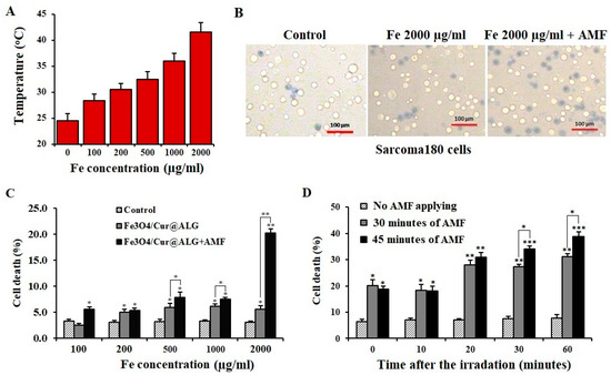 In vitro magneto-inductive heating of Fe3O4/Cur@ALG NPs induces the death of sarcoma 180 cells. (A) The temperature (°C) values reached after stimulating the Fe3O4/Cur@ALG NPs with an alternative magnetic field (AMF). (B) Images of sarcoma 180 cells stained with Trypan blue after incubation with 2000 µg/mL Fe3O4/Cur@ALG NPs and AMF. (C) Percentages of cell death (%) after 30 min of AMF irradiation. (D) Cell death (%) at different time points after finishing the 30- and 45-min AMF protocols after treatment with 2000 µg/mL Fe3O4. Data are presented as the mean ± SD of triplicate experiments. * p ˂ 0.05; ** p < 0.01; *** p < 0.001.
