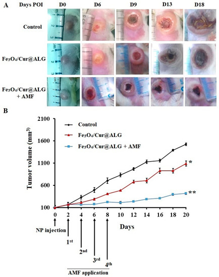 Magnetic hyperthermia treatment in sarcoma 180 tumor-bearing mice. (A). Images of tumors by days post-injection (POI) in the three groups of mice: the control without treatment; the mice injected with Fe3O4/Cur@ALG NPs; and the mice injected with Fe3O4/Cur@ALG NPs subjected to an alternative magnetic field (AMF) (Fe3O4/Cur@ALG + AMF). (B) The tumor growth curve during the in vivo experiment. After four treatments at 48 h intervals, the mice were continuously observed, and the volume of tumors was measured every two days. Data are presented as the mean ± SD (n = 10). * p ˂ 0.05; ** p < 0.01.