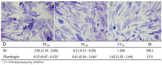 Light microscopy images of CC cultures infected with T. cruzi (Y strain) (A–C) or untreated (A), or exposed to 0.37 µM plumbagin (B) and 0.12 µM plumbagin (C). Bars = 20 μm. Phenotypic activity (D) (EC50 and EC90 μM) of plumbagin and benznidazole (Bz) against intracellular forms (Y strain) of T. cruzi and cytotoxicity (LC50, μM) upon primary cardiac cell (CC), with their respective selectivity indexes (SIs). Values in parentheses are standard errors of the mean with 95% confidence intervals. Arrows: intracellular parasites.