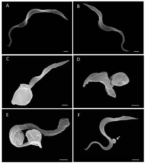 Scanning electron microscopy (SEM) examination of T. cruzi bloodstream trypomastigotes (Y strain) treated for 2 h (C) and 24 h (D–F) with Plumbagin at 0.8 μM (corresponding to EC50/24 h). Untreated parasites ((A) 2 h, and (B) 24 h) showing typical morphology. Bloodstream forms exposed to Plumbagin displayed several morphological alterations including body retraction (C,E), a twist of the parasite body (D) and profuse shedding events ((F) white arrows). Bars = 1 μm.
