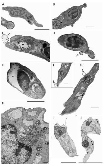 Ultrastructural analysis: transmission electron microscopy (TEM) of bloodstream trypomastigotes (Y strain) treated for 2 h with Plumbagin at 0.8 μM (corresponding to EC50/24 h). (A,B) Untreated parasites showing typical morphology. (C–I) Bloodstream forms exposed to Plumbagin displayed several morphological alterations including profuse shedding events ((C,D,F,G) black arrows), a swollen nuclear envelope ((E) asterisk) and flagellar pockets ((E) asterisk), insults in Golgi (C, black star), the presence of concentric membranes and myelin figures ((G) arrowhead), a high number of intracellular dilated vesicles (H–J) and numerous ghost parasites with retained KDN and microtubules (I,J). N, nuclei; F, flagellum; K, kinetoplast; M, mitochondria. Bars = 1 μm.