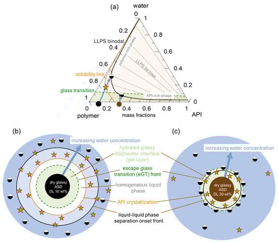 Figure 1 schematically shows the ternary phase diagram (Figure 1a) of an API/polymer/water system and the hydration pathway of the ASD as it transitions into the bulk aqueous medium during dissolution, as exemplified for ASDs with 10 wt % (Figure 1b) and 30 wt % of DL (Figure 1c). The ternary phase depicts the regions of API crystallization or LLPS that form when the ASD is exposed to water. Depending on the concentration of the ternary mixture, the driving force(s) for equilibrium determines what phase changes occur, e.g., either crystallization in API-supersaturated regions or LLPS, or both. Furthermore, at concentrations below the glass transition (the green region in Figure 1a), the mobility of the system is reduced, which can kinetically hinder phase changes.