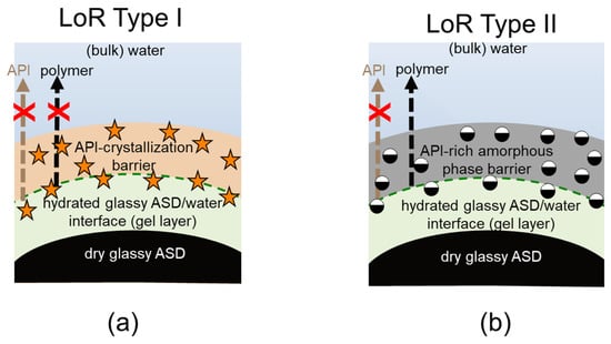 Schematics of LoR Type I and Type II for ASD/water interfacial layers, resulting in LoR (passivation) due to the crystallized API barrier formed at the surface (a), and due to the amorphous API barrier triggered by liquid-liquid phase separation at the surface (b).