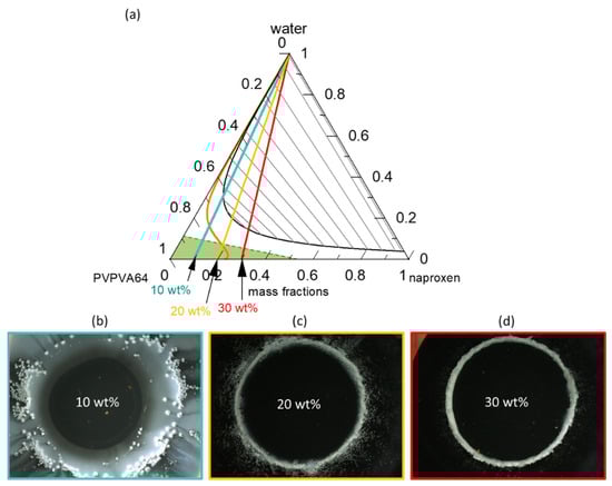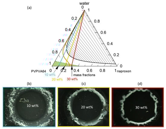 Figure 3a presents the modeled naproxen/PVPVA64/water ternary phase diagram at 37 °C; Figure 3b–d shows the METT images of the ASDs at DLs of 10 wt %, 20 wt %, and 30 wt % when in contact with water.