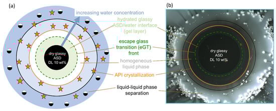 As soon as the surface of an ASD encounters water, several interplay processes, including water sorption, phase separation, crystallization, and the viscosity of the formed (gel) layer, determine the ASD/water interfacial behavior and, subsequently, the dissolution performance of the formulation. The physicochemical properties of the APIs and the polymer, their interactions in the ASD, and, ultimately, their interactions with water determine the thermodynamics and kinetics of these processes. Previous works by Sadowski and coauthors demonstrated that phase transformations (crystallization and phase separation) associated with ASD/water can be thermodynamically modeled quantitatively [,,,,,,,]. The kinetics aspect is strongly influenced by the glass transition behavior of the system and the individual components []. The interplay between phase transformations and glass transition during the ASD dissolution can be understood through the API/polymer/water ternary phase, coupled with the glass transition.