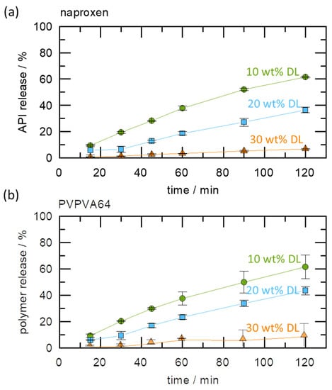 Release profiles of (a) naproxen and (b) PVPVA64 at 37 °C for naproxen/PVPVA64 ASD, with DLs of 10 wt % (green circles), 20 wt % (blue squares), and 30 wt % (orange triangles).
