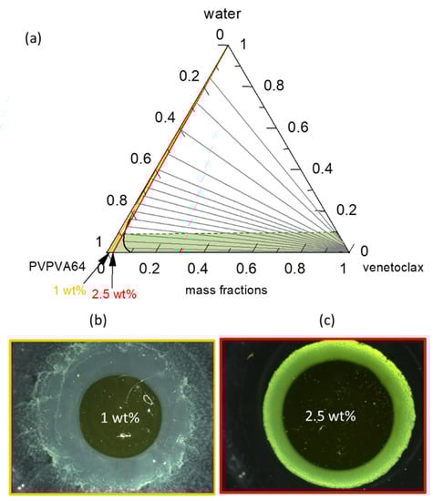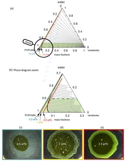 Figure 10a shows the modeled venetoclax/PVPVA64/water phase diagram at 50 °C.