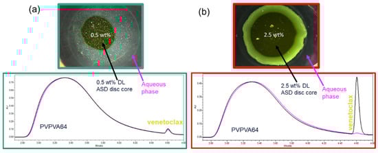 After the venetoclax ASD METT experiments (see Section 3.2.3), samples were collected from the ASD disc core and the aqueous phase. The aqueous phase samples were dried overnight in the vacuum chamber (40 °C; 70 mbar) to remove the water. The ASD disc core and the dried aqueous phase samples were separately dissolved in THF. The solutions were adjusted to 2 mg/mL (for 0.5 wt % and 1 wt % DL of ASD) or 1 mg/mL (for 2.5 wt % DL of ASD)). All samples were centrifuged at 21,000 rcf and 4 °C for 5 min. The composition of the dried aqueous phase was determined, relative to the ASD disc core composition.