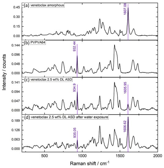 An ASD disc with 2.5 wt % DL of venetoclax, before and after exposure to de-ionized water at 37 °C for 4 h and vacuum-dried at 25 °C, was analyzed with a Raman microscope (HORIBA Labram HR Evolution, Oberursel, Germany). A near-IR (633 nm) laser was employed to illuminate the samples. Spectra were collected using a 100×/0.90 objective and a 100 µm confocal pinhole. A 600 line·mm−1 rotatable diffraction grating was used, set at 5 s of acquisition time and 8 accumulations. Spectra were collected in the range from 250 to 3750 cm−1.
