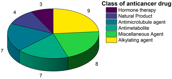 A total of 38 approved anticancer drugs were used in CNM-based nanocarriers in the literature, a breakdown of which can be seen in Figure 1. The anticancer drugs were further classified according to their mechanism of action, and the prevalence of each class is shown in Figure 1. The classes are as follows: (1) Alkylating agents—these work by adding alkyl groups to DNA, which can lead to DNA strand breaks and inhibit DNA replication; (2) Antimetabolites—these interfere with the synthesis of DNA, RNA, and proteins by mimicking essential cellular metabolites; (3) Natural products—this category consists of chemotherapeutic agents derived from natural sources, such as plants, microorganisms, or marine organisms. These agents often target specific aspects of cell division or DNA replication; (4) Hormone therapies—these target hormone-dependent cancers by interfering with the action of specific hormones or hormone receptors; (5) Antimicrotubule agents—these drugs target the microtubules, which play an essential role in cell division. By disrupting the formation or function of microtubules, these agents can inhibit cell division and lead to cancer cell death; (6) Miscellaneous agents—these include chemotherapeutic drugs that do not fit neatly into any of the other categories. The most diverse class of anticancer drugs used were alkylating agents, which is not surprising, as this class includes many Pt-based drugs, which can be easily complexed with oxidized CNMs. The miscellaneous-agent section contained five tyrosine kinase inhibitors, indicating the popularity of this class of drug. Hormone therapies were the least popular class of chemotherapy agents, with only three entries.