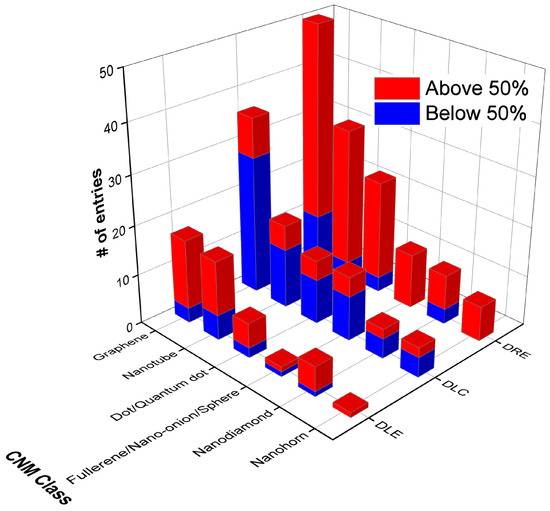 The DLCs, DLEs, and DREs of nanocarriers are given as the number of entries above and below 50% in Figure 3. This was performed to make the entries more comparable given the differences in the sample sizes. A total of 152 out of 191 nanocarriers found in the literature had DLC, DLE, and/ or DRE data, and where DLC data were given, less than 35% of the nanocarriers were found to display values above 50%. This is similar for all CNMs, and surprisingly, graphene is the lowest, with only 22% of nanocarriers above 50% DLC. A much greater proportion of nanocarriers show DLEs above 50%, with fullerenes showing the lowest percentage of DLE values above 50%, and nanohorns displaying the highest at 100%; however, only one entry was available. This indicates that drug loading is an efficient process. In general, either a DLC or DLE value was given, with the DLE higher than the DLC.