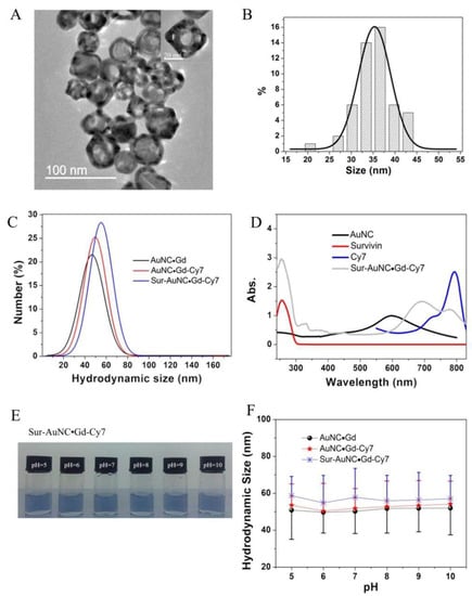 (A,B) TEM imaging (A) and the statistical sizes (B) of AuNC nanoparticles. (C) Dynamic light scattering diameter distributions of AuNC•Gd, AuNC•Gd–Cy7 particles, and Sur–AuNC•Gd–Cy7 nanoprobes. (D) UV-vis absorption spectroscopy curves of AuNC, survivin, Cy7, and Sur–AuNC•Gd–Cy7 nanoprobes. (E) Stability images of Sur–AuNC•Gd–Cy7 nanoprobes in aqueous solutions with different pHs. (F) Stability curves of various AuNC•Gd, AuNC•Gd–Cy7 particles, and Sur–AuNC•Gd–Cy7 nanoprobes in aqueous solutions with different pHs.