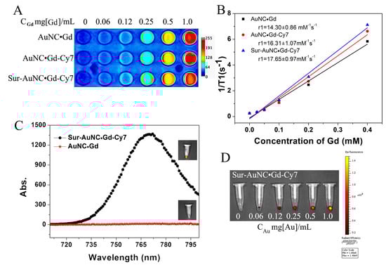 The imaging characteristics of AuNC•Gd, AuNC•Gd–Cy7 particles, and Sur–AuNC•Gd–Cy7 nanoprobe solutions were tested on a 3.0T clinical magnetic resonance imaging and fluorescent spectrometer. With the concentration of Gd increasing, the signal of T1-weighted images has a high enhancement (Figure 2A). The following Figure 2B illustrates the corresponding magnetic relaxation rate based on gadolinium concentration (r1AuNC•Gd = 14.30 ± 0.86 mM−1s−1, r1 AuNC•Gd–Cy7 = 16.31 ± 1.07 mM−1s−1, r1 Sur–AuNC•Gd–Cy7 = 17.65 ± 0.97 mM−1s−1), which is much higher than that of magnevist (r1 = 4.5 mM−1s−1) []. The Sur–AuNC•Gd–Cy7 nanoprobes solution has good fluorescence imaging performance (Figure 2C,D). The Sur–AuNC•Gd–Cy7 nanoprobes have the ability to generate fluorescence images after loading with Cy7. The nanoprobes displayed a strong fluorescence signal when excited at 750 nm. The nanoprobes had a high signal-to-background ratio, and the fluorescence intensity was stable over a wide range of concentrations.
