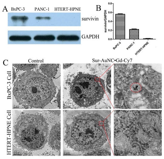 Distinct levels of survivin protein are observed in pancreatic cancer cells (Figure 3A,B). The human pancreatic ductal epithelial cells HTERT-HPNE do not naturally express survivin protein. The level of survivin protein expressed in BxPC-3 cells is higher compared to that expressed in PANC-1 cells. Vesicles containing nanoprobes are seen in the BxPC-3 cells after incubation with Sur–AuNC•Gd–Cy7 nanoprobes for 24 h (Figure 3C). As a control, no probe vesicles are seen in the HTERT-HPNE cells. Part of the reason is that pancreatic cancer BxPC-3 cells have a vigorous metabolism. Notably, the survivin protein is absent in the HTERT-HPNE cells, while the BxPC-3 cells demonstrate a marked presence of the survivin protein.