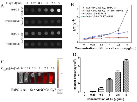 After being exposed to different concentrations of AuNC•Gd particles and Sur–AuNC•Gd–Cy7 nanoprobes for 24 h, BxPC-3 cells and HTERT-HPNE cells were harvested and dispersed on agarose solutions. The T1 signal intensity was detected (Figure 4A,B). Evidently, the T1 signal intensity of BxPC-3 cells that were subjected to the targeted Sur–AuNC•Gd–Cy7 nanoprobes was considerably greater than that of cells that were subjected to the AuNC•Gd particles. The outcome is in line with the findings of cellular electron microscopy. Upon exposure to the Sur–AuNC•Gd–Cy7 nanoprobes, the T1 signal intensity exhibited by HTERT-HPNE cells was observed to be comparatively lower than that of BxPC-3 cells. The fluorescence signal exhibited by the Sur–AuNC•Gd–Cy7 nanoprobes remained constant even after being subjected to incubation with BxPC-3 cells (Figure 4C,D). The results of the experiment demonstrate that the targeted Sur–AuNC•Gd–Cy7 nanoprobes are effective at targeting pancreatic cancer cells. The findings also suggest that the nanoprobes could be used as potential imaging reagent.