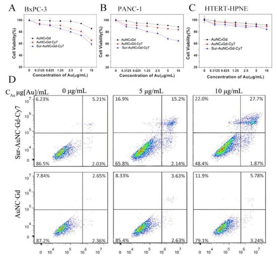 (A–C) The cytotoxicity performance of AuNC•Gd, AuNC•Gd–Cy7 particles, and Sur–AuNC•Gd–Cy7 nanoprobes in BxPC-3 cells (A), PANC-1 cells (B), and HTERT-HPNE cells (C) after incubation for 24 h. (D) Flow cytometric analyses of BxPC-3 cells after incubation with AuNC•Gd particles and Sur–AuNC•Gd–Cy7 nanoprobes for 24 h.