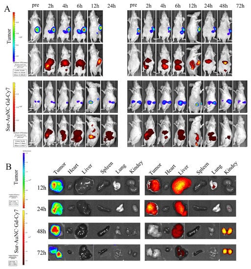 (A) Fluorescence images of BxPC-3 xenograft-bearing mice after intravenous (i.v.) injection of Sur–AuNC•Gd–Cy7 nanoprobes at different times. (B) Ex vivo images of major organs, such as the heart, liver, spleen, lung, kidney, and tumors excised at different times post-injection.