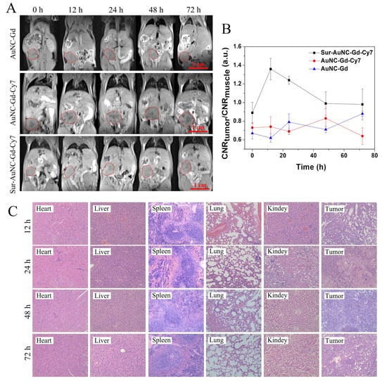 (A) T1-weighted tumor contrast enhancement after i.v. injection of AuNC•Gd, AuNC•Gd–Cy7 nanoparticles, and Sur–AuNC•Gd–Cy7 nanoprobes. (B) The changes in MR signal intensity of tumor tissue after treatment with nanoparticles and nanoprobes. (C) H&E analyses of different organ tissues and tumor tissues after treatment with Sur–AuNC•Gd–Cy7 nanoprobes, magnification 100×.