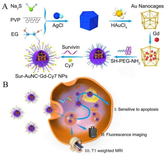 All the reagents used in the experiment were purchased from commercial companies and were used without extra purification. Chloroauric acids (HAuCl4), polyvinyl pyrrolidone (PVP), dimethyl formamide (DMF), and other agents used in this experiment were purchased from Sinopharm Chemical Reagent Co. Ltd. (Shanghai, China). The compounds: 1, 4, 7, 10-tetraazododecane, 1, 4, 7, 10-tetracarboxylic acid, and gadolinium complex (DOTA–Gd–NHS ester) came from Xi’an ruixi Biological Technology Co., Ltd. (Xi’an, China) Sulfo-N-hydroxysuccinimide (sulfo–NHS) and Cy7–NHS were purchased from Sigma Aldrich (St. Louis, MO, USA). Thiol poly-(ethylene glycol) amine (SH–PEG–NH2) was purchased from Beijing Jenkem Technology Co., Ltd. (Beijing, China). The compound, 1-ethyl-(3-dimethylaminopropyl) carbodiimide hydrochloride (EDC–HCl), was purchased from J&K Chemicals. Survivin’s antisense nucleotide was from Shanghai Sangon Biotech Co., Ltd. (Shanghai, China).