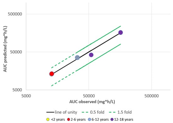 Infliximab is one of the more well-studied monoclonal antibodies in terms of PBPK modelling. Pan et al. constructed an Infliximab PBPK model for full-term neonates to adolescents []. Using this PBPK study as an example, we evaluated how PBPK prediction accuracy varied across different paediatric age groups. The area under the curve (AUC) predicted; the over-observed ratio was used as a measure of prediction accuracy. In this study, PBPK modelling across all paediatric age groups had a prediction accuracy that fell within 0.5–1.5-fold change (Figure 1), suggesting that it is reasonably accurate. In the same study, allometric scaling using popPK parameters also found that predicted mean clearance values for infliximab fell within two-fold of the observed data []. These findings were also supported by Malik et al., who reported that PBPK models for infliximab achieved predictions within two-fold of the observed concentrations 66.7% of the time for children above 4 years old [,]. Additionally, when multiple adult popPK models were allometrically scaled for Infliximab, the poorest model still fell below the two-fold error threshold []. Taken together, the PBPK model for Infliximab showed comparable prediction accuracy to the classical approach of applying allometric scaling to popPK parameters.