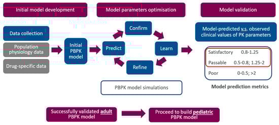 While there has been considerable progress in PBPK modelling for Infliximab, the same PBPK model does not guarantee similar success for other mAbs and disease states. Moving forward, PBPK studies should expand their scope to include the other mAbs approved for paediatric usage, subject to clinical data availability for the PBPK model development. The general workflow of PBPK model development based on the aforementioned Infliximab case study is described in Figure 2, which can be ‘adapted’ for other mAbs paediatrics PBPK model development []. Another aspect that future PBPK studies could explore is to account for the differences in the target receptor expression across different disease states [], given that target-mediated drug disposition remains one of the key elimination pathways for mAbs.