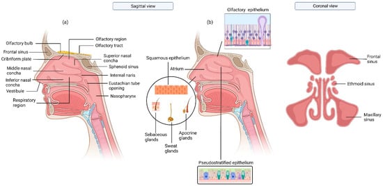The nasal cavity is divided into three distinct regions: nasal vestibule (also known as the nostrils or external nasal valve), respiratory region, and olfactory region (Figure 1). The nasal vestibule is half covered with keratinized stratified squamous epithelium, which contains coarse hairs or vibrissae that filter inhaled particles larger than 5 µm [] and is also half covered with respiratory epithelium, composed of pseudostratified ciliated columnar epithelial cells []. Just above the vestibules, the atrium is present, which is lined by squamous epithelium. Vibrissae (nose hairs), sebaceous glands, sweat glands, and apocrine glands are also present in this region []. The respiratory region constitutes the largest area of the nasal cavity, covered with ciliated pseudostratified epithelial and mucus-secreting goblet cells.