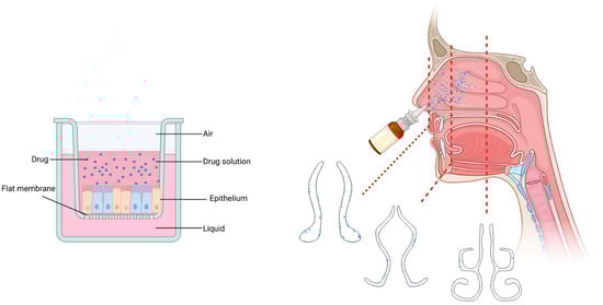 The abovementioned physiological barrier factors that influence nasal drug absorption and systemic bioavailability may vary for different drugs depending on their physicochemical characteristics, e.g., solubility, hydrophilicity, and molecular weight (MW). The physicochemical characteristics of the drug may impact the drug absorption rate through the nasal mucosa, with some studies indicating that small molecules tend to have higher absorption rates than larger molecules (MW > 1 kDa) []. On the other hand, lipophilic drugs, for example, tend to have higher absorption rates than hydrophilic drugs [,]. Similarly, The pH of the drug solution can also influence the rate and extent of absorption, as the nasal mucosa has a specific pH range at which it functions optimally [].