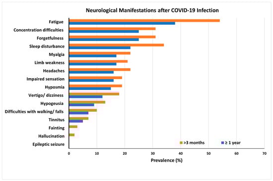 Long COVID involves continuous, long-term manifestations of the residual damages and sequelae of coronavirus infection caused by human severe acute respiratory syndrome coronavirus 2 (SARS-CoV-2), a large positive-stranded enveloped RNA virus that generally provokes respiratory diseases [1,2]. SARS-CoV-2 predominantly affects the respiratory system but can also invade the nervous system and cause multiple neurological disorders [3,4,5]. Patients at risk following COVID-19 infection may still exhibit a range of long-term neurologic and psychiatric disorders (Figure 1) and may not fully recover several months post-infection. These sequelae include mild symptoms, such as headaches; extreme tiredness (fatigue); loss of smell, taste, or tactile sensing functions; cognitive impairment; depression; delirium; and psychosis [5]. More severe documented outcomes include cases of encephalitis, Guillain–Barre syndrome, and stroke [5]. These long-term neurological problems following SARS-CoV-2 infection have been described as manifestations of post-COVID-19 syndrome, long COVID, long haulers, or the post-acute sequelae of SARS-CoV-2 (PASC) [6,7]. A study performed in Italy found that 87.4% (n = 179) of patients who recovered from COVID-19 still report the persistence of at least one symptom, particularly fatigue and dyspnea [8]. Another work reported that the most prevalent symptoms of patients in the 6 months following hospitalization were tiredness (34%), memory/attention problems (31%), and sleep disturbances (30%). Neurological abnormalities were found in 40% of patients who underwent a neurological examination, including hyposmia (18.0%), cognitive impairments (17.5%), postural tremor (13.8%), and mild motor/sensory deficits (7.6%) [9]. Moreover, postmortem studies have established brain tissue edema and partial neuronal degeneration in deceased patients [10].