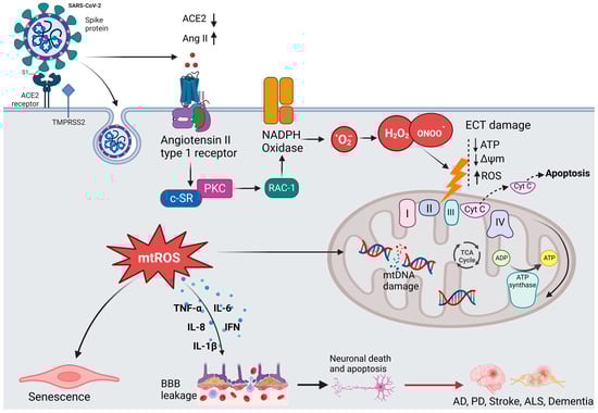 The hypothesized mechanism of coronavirus-induced neuronal damage via oxidative stress and mitochondria dysfunction. SARS-CoV-2 infection occurs when TMPRSS2 primes the spike proteins for proteolysis, allowing the binding to ACE2. The affinity interaction triggers the binding of Ang II to the angiotensin type 1 receptor (AT1R), activating NADPH oxidase. This leads to mitochondrial electron transport chain (ETC) damage via the release of oxidative and nitrosative species, subsequently increasing the formation of mitochondrial reactive oxygen species (mtROS). The signaling pathways mediated by mtROS trigger the production of inflammatory cytokines, which can compromise the blood–brain barrier, thus resulting in neuronal damage. Additionally, mtROS cause nuclear and mitochondrial damage, which prolongs mitochondrial dysfunction and encourages inflammatory senescence (created with BioRender).