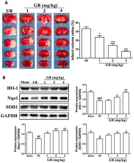 Effects of Ginkgo biloba on infarct volume and expression of proteins associated with antioxidant effects in middle cerebral artery occlusion (MCAO) rat models. (A) MCAO rats were treated with various GB doses for 72 h, followed by triphenyl tetrazolium chloride (TTC) staining and statistical analysis of the cerebral infarct area. The results revealed a significant reduction in infarct volume ratios after GB treatments in a dose-dependent manner. (B) Results of Western blot analysis and semi-quantitative measurements of the levels of HO-1, Nqo1, and SOD1 proteins in the ischemic penumbra region of MCAO rats treated with various doses of Ginkgo biloba for 24 h. Antioxidant-related proteins in the MCAO group drastically decreased after cerebral ischemic injury compared to the normal group, while rats treated with various concentrations of GB showed a marked increase in the expression of HO-1, Nqo1, and SOD1. Data represented as the mean ± SD from eight rats of each group. (# p < 0.05, ## p < 0.01, and ### p < 0.001 vs. the sham group; * p < 0.05 and *** p < 0.001 vs. the I/R group). Adapted with permission from [119]. Copyright {2019} Science-HHS Public Access (PubMedCentral).