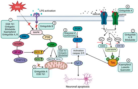 Schematic representation of the anti-apoptotic and anti-inflammatory effects of Ginkgo biloba extract (EGb) and its constituents. (1) Inhibition of ROS and suppression of the expression of pro-inflammatory mediators (e.g., COX-2 and NO) and pro-inflammatory cytokines (TNF-α, IL-6, and IL-1β) via the NF-κB signaling pathway. EGb can also inhibit the STAT 1/3 pathway. (2) Blocking of iNOS expression through a reduction in NO levels. (3) Inhibition of LPS-induced inflammatory response. (4) Prevention of mitochondrial oxidative stress by promoting the expression of anti-apoptotic proteins. (5) Inhibition of TLR4-NF-κB signaling through the PI3K/Akt pathway. (6) Prevention of the intracellular accumulation of p-Tau and cellular protection from Tau-hyperphosphorylation-related toxicity. (7) Blocking signaling pathways that involve CDK5, p38 MAPK, and GSK-3β. (8) Inhibition of NMDA and AMPA receptors, preventing the phosphorylation of c-Jun N-terminal kinase (JNK). (Created with BioRender).