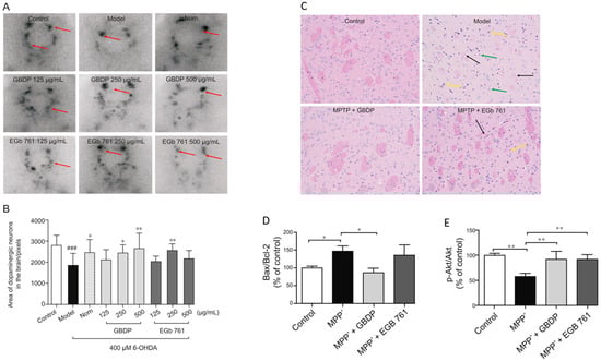 Representative images of dopaminergic neurons in the zebrafish brain, acquired using TH immunostaining. (A) Ginkgo biloba dropping pills (GBDP) prevented the loss of dopaminergic neurons induced by 6-OHDA. The red arrow shows dopaminergic neurons in the zebrafish brain. (B) The area of the dopaminergic neurons calculated for each group. ### p < 0.0001 vs. the control group; * p < 0.05 and ** p < 0.001 vs. the 6-OHDA group (n = 10 per group). (C) HE staining of brain sections of an MPTP-induced mouse model of Parkinson’s disease. The black arrow indicates significant diminished and loose nerve fiber components, which are lightly stained, while the yellow arrow shows intensive staining of the nuclei of several atrophied cells. Glial cells exhibited modest hyperplasia, as shown by the green arrow. (D,E) In MPP-treated human SH-SY5Y cells, GBDP administration reduced the Bax/Bcl-2 ratio and elevated Akt/GSK3β. ### p < 0.0001 vs. the MPP+ group. Adapted with permission from [152]. Copyright {2021} Science-HHS Public Access (PubMedCentral).