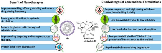 Although preclinical studies of antioxidants to improve neuronal dysfunction have shown encouraging results, the outcomes of clinical trials have not always been conclusive. In general, antioxidant compounds have mainly suppressed clinical symptoms but are unable to halt or reverse disease progression [177]. In the absence of delivery systems, Ginkgo biloba (120 mg daily dosage) did not improve patient performance in neuropsychological tests of memory, attention, or speech during a 6-week, placebo-controlled, double-blind clinical study including 219 individuals [178]. Similarly, a feasibility investigation by Dodge et al. reported no difference in episodic memory deterioration in patients who received 240 mg/day of Ginkgo biloba or a placebo during an average follow-up period of 3.5 years [179]. The clinical translation of free antioxidant drugs may be hampered by several issues related to drug delivery efficacy. These problems include low drug bioavailability, low permeability through the CNS, limited half-life, and toxicity [180] (Figure 7). Significant efforts have been made to increase the clinical efficacy of both natural and synthetic antioxidants by using drug delivery systems to overcome their drawbacks. For example, investigations of drug conjugates, complexes, and nanocarriers of various polymeric materials have been performed [181,182,183].