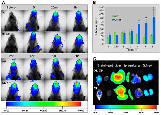 Delivery of odorranalectin (OL)-conjugated NPs to the brain monitored with an in vivo imaging system. (A) Fluorescence images of the upper half-body of the mouse overlaid on X-ray images, following intranasal administration of DiR-labeled NPs and OL-conjugated NPs at different time points. (B) Semi-quantitative results of the fluorescence intensity in the brain region. * p < 0.05, significantly different. (C) Fluorescence images of major organs overlaid on white-light images at 8 h after intranasal administration of DiR-loaded NPs and OL-conjugated NPs to mice. Copyright © 2011 Elsevier B.V. All rights reserved, with permission from Elsevier [191].