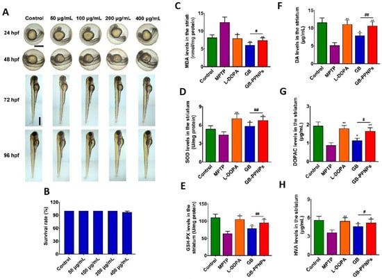 In vivo toxicity analysis of ginkgolide-B-loaded GB–PPNPs in zebrafish embryo and MPTP-induced murine model of PD. (A) Zebrafish embryos were treated with different concentrations of GB–PPNPs (50, 100, 200, and 400 μg/mL), and at 96 hpf, the embryo morphology was visualized via microscopy. The survival rates, hatching rates, heart rates, and zebrafish body length were calculated. Scale bar: 500 μm. (C–H) Impact of GB–PPNPs on the striatum with determined levels of (A) MDA, (B) SOD, (C) GSH-Px (means ± SD, n = 4), (D) dopamine, (E) DOPAC, and (F) HVA (n = 7). * p < 0.05 and ** p < 0.01 correspond to different treatments vs. MPTP. # p < 0.05 and ## p < 0.01 correspond to GB–PPNPs vs. GB. Adapted with permission from [198]. Copyright {2022} Science-HHS Public Access (PubMedCentral).