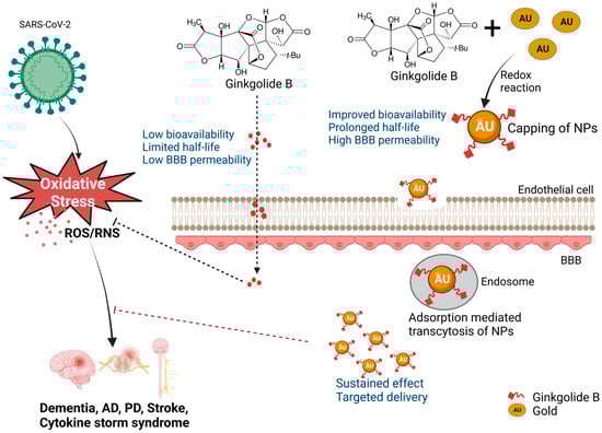 Antioxidant-based nanotherapy via green synthesis of nanoparticles. The scheme illustrates the benefits of delivering Ginkgo biloba biogenic metallic NPs to increase their half-life, capacity to penetrate the BBB, bioavailability, and sustained effect, thus neutralizing oxidative stress in neurological disorders (created with BioRender).
