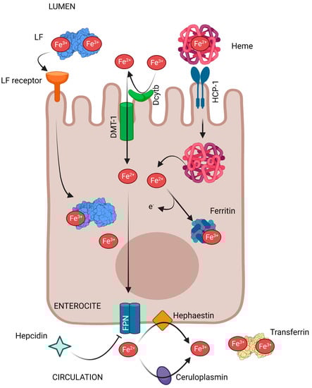 As reviewed by Artym et al. [7], and summarized here (Figure 2), iron ions are obtained from the diet by enterocytes in both the duodenum and jejunum, after which they are transported by the carrier protein—divalent metal transporter 1 (DMT-1). Only Fe2+ ions can enter into enterocytes being necessary to reduced Fe3+ ions present in the diet by the action of duodenal cytochrome b (Dcytb). Heme Fe2+ ions from meat are transported to enterocytes via the heme carrier protein 1 (HCP-1) and are released into the cytosol through heme oxygenase 1 (HO-1). The Fe2+ ions in enterocytes can either be temporarily stored in the iron-binding protein—ferritin (Ftn), or be released into the circulation by the basolateral membrane transporter—ferroportin (FPN), which is the only exporter of iron ions in cells. Subsequently, there are two oxidases, membrane hephaestin and serum ceruloplasmin (Cp), which oxidize Fe2+ to Fe3+ ions. Then, Fe3+ ions are transported in the blood by transferrin (TF) to every cell and tissue in the body. The expression of both iron transporters mentioned previously (DMT-1 and FPN) is regulated by the available systemic iron stores. Therefore, when there is a high level of iron, their expression decreases, and increases again when reserves are reduced. In addition, iron homeostasis is regulated at the systemic level by the hepatic hormone, hepcidin that is a central regulator of systemic iron. When hepcidin binds to FPN, it causes the internalization and degradation of this iron transporter, and the release of iron from the intestine into circulation is inhibited.