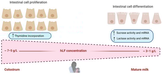 In vivo and in vitro studies have aided the study of the positive effects of LF on the intestine. Regarding in vitro studies, native hLF (with around 10% iron saturation) was observed to bidirectionally regulate cellular growth in Caco-2 cells in a dose-dependent manner [42]. When high LF concentrations were used, there was a strong increase in intestinal epithelial cell proliferation, whereas when using low LF concentrations, there was an activation of epithelial cell differentiation, as was indicated by the upregulation of sucrase and lactase activities (Figure 3). This bidirectional activity of LF confers flexibility, according to the need of the environment and its changing concentration in breast milk during lactation (higher concentrations at the beginning of lactation) [43]. A study by Buccigrossi et al. [42] mimicked the two types of lacteal secretions with different LF concentrations, colostrum and mature milk. It was observed that the higher concentration of LF in colostrum helps the accumulation of small intestinal tissue mass, whereas the main function of LF, at lower concentrations in mature milk, was mainly directed to the proper differentiation of progenitor cells to one of its functional cell types in the small intestine. Moreover, in the work of Blais et al. [44], LF was found to increase Caco-2 cell proliferation in a dose-dependent manner. Higher cell density and an increase in cell differentiation indicators were obtained, such as brush-border-associated enzymatic activities or amino acid transporters, and were increased with different kinetics. LF was also noted to be able to decrease Caco-2 cell spontaneous apoptosis. bLF was identified as being able to promote cell growth and arrest cell-cycle progression in the G2/M-phase and also, on human intestinal epithelial crypt cells (HIECs), which are more similar to the cells in the human small intestine [19].
