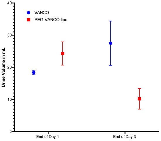 Total rat urine volume at the end of days one and three of treatment with vancomycin hydrochloride in PBS (VANCO) or vancomycin-loaded PEGylated liposomes (PEG-VANCO-lipo) in PBS given intravenously through jugular vein catheter at 150 mg/kg body weight every day for three days, n = 6. No statistically significant difference was identified in the two groups when data were analyzed between the two groups at the end of days one and three of the treatment unpaired t-test at a 95% confidence interval (p > 0.05).