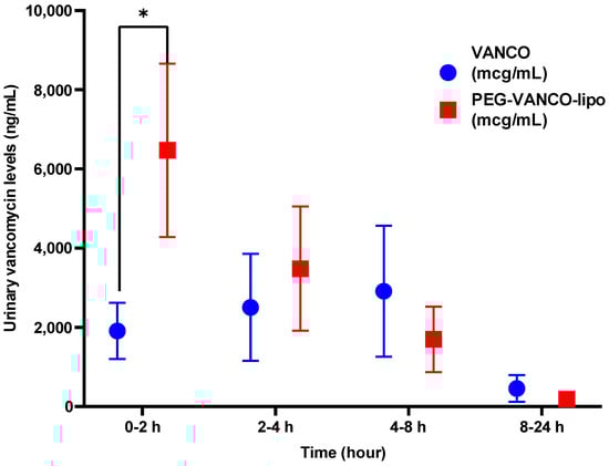 Almost 3-fold less urinary vancomycin levels were observed for PEG-VANCO-lipo compared to the vancomycin group on day three at the 0–2 h time point and was statistically significant (p < 0.05, unpaired t-test) (Figure 2).