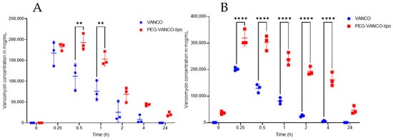 Plasma vancomycin levels (mcg/mL) of rats treated with vancomycin hydrochloride in PBS (VANCO) or PEG-VANCO-lipo in PBS given intravenously through jugular vein catheter at 150 mg/kg body weight every day for three days, n = 3, analyzed by LC-MS/MS after sample treatment on day one (A) and day three (B). Data were analyzed using Tukeys’ two-way ANOVA at a 95% confidence interval (p < 0.05). Each animal represents a data point circle or square. ** indicates p ≤ 0.01, **** p ≤ 0.0001.