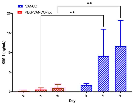 Urinary KIM-1 levels of rats after treatment with 150 mg/kg/day of either vancomycin (VANCO) or PEG-VANCO-lipo over three days, n = 6. Data were analyzed using Tukeys’ two-way ANOVA at a 95% confidence interval (p < 0.05) ** indicates p ≤ 0.01.