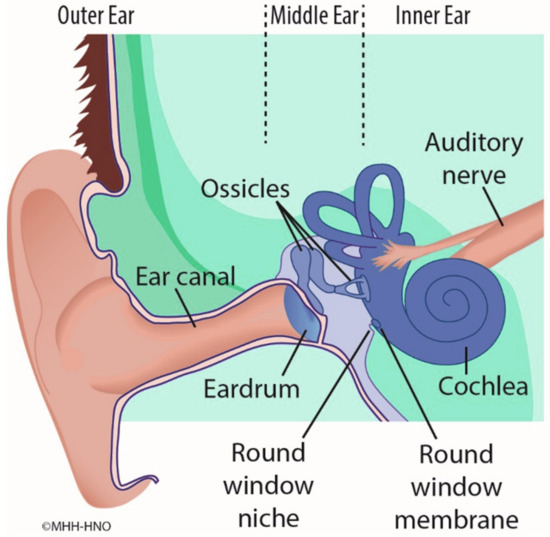 There is increasing interest in novel concepts of medical treatment of the inner ear in order to treat disorders such as Menière’s disease (MD) and idiopathic sudden sensorineural hearing loss (ISSHL). Pharmaceutical substances can pass from the middle to the inner ear via diffusion through the semipermeable round window membrane (RWM). The RWM is located deep in a recess, the round window niche (RWN), between the middle and inner ear (Figure 1). There are various pharmacological treatment methods and drug delivery strategies. For example, it is a common treatment to inject drugs or drug-laden gels directly into the middle ear cavity (intratympanically) by needle through the tympanic membrane [1]. However, such methods have a significant disadvantage. Large portions of the applied drug cannot diffuse through the RWM in the inner ear because it does not come into sufficient contact with it. Instead, much of the applied drug is absorbed by the mucosa of the middle ear or evacuated from the middle ear space by the Eustachian tube [2,3].