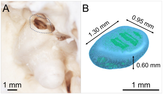 Figure 2A shows a photograph of the anatomical structure of an exemplary guinea pig round window niche and Figure 2B illustrates a graphic of the digital 3D model of a mean GP-RNI. The model has approximate nominal dimensions of a length of 1.30 mm, a width of 0.95 mm and a height of 0.60 mm. The digital 3D model was established by reconstructing 3D volumes from microCT images (XtremeCTII, ScancoMedical AG, Brüttisellen, Switzerland) via 3D SlicerTM software version 4.11 (Surgical Planning Laboratory, Brigham and Women’s Hospital, Harvard Medical School, Boston, MA, USA) [35,36].