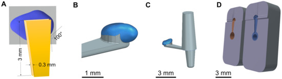 The 3D model of the mean GP-RNI was joined with a 3D model of a handle structure (Figure 3A (scheme), Figure 3B (final design)). The handle is an element to ensure good gripping and handling by forceps during the implantation process. This completed 3D model of the mean GP-RNI with a handle is designed to be manufactured via µIM. A sprue structure was added to the 3D model to obtain a flow path for the µIM material (Figure 3C). The sprue structure is removed from the µIM implant after the µIM process. Figure 3D shows the final 3D model of the mold (2 parts). It is based on the 3D model of the GP-RNI with a handle and the sprue. The 3D model of the mold will be used for rapid tooling of the mold via DLP 3D printing.