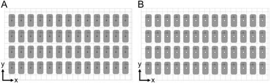 Placement of molds on build platform. Fifty-two of each lower (A) and upper (B) halves of the final molds were printed in the same orientation to eliminate possible differences in xy resolution.