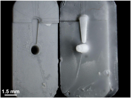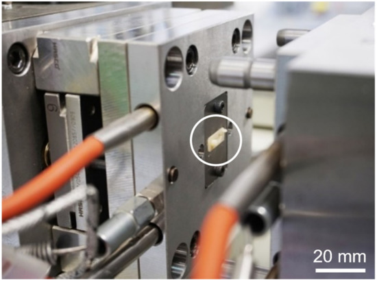 Micro injection molding (µIM) investigations were performed using a machine of type formicaPlast (Klöckner DESMA Elastomertechnik GmbH, Achim, Germany), modified as shown previously [29] and featuring an injection piston with a diameter of 3 mm. For µIM, a 3D-printed mold was inserted in the µIM machine using customized metallic housing as shown in Figure 5. Each mold was used only once for µIM. The µIM process was performed at a mold temperature of 160 °C and an injection flow rate of 4.2 mm3/s. The mold temperature of 160 °C was necessary for the heat-driven curing process of the used silicone elastomer. The shot weight (inclusive sprue) was 8.2 mm3. No extra holding pressure was applied. After injection of the prepared mixture of the silicone elastomer DEX mixture, there was a crosslinking time of 120 s.