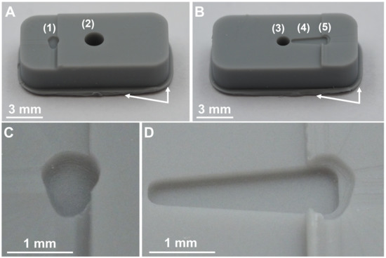 Photographs of DLP 3D-printed mold after 3D printing (but before finishing). The mold consists of two parts. (A) shows the upper half of mold featuring the form of the upper half of the GP-RNI (1) and the sprue (2). (B) shows the lower half of the mold featuring the form of the lower half of the GP-RNI (3) and the form of the handle structure of the GP-RNI (4). The mold is designed to use the handle structure as a runner structure for liquid µIM material during µIM process. Moreover, there is the “cold slug” structure (5) for µIM process. Remnants of the supporting structure are marked via white arrows. (C,D) show the forms of the GP-RNI in more detail. The small structures are 3D printed with a high grade of precision because a high-resolution DLP 3D printing process featuring a relatively low z-layer height of 10 µm per layer was used.